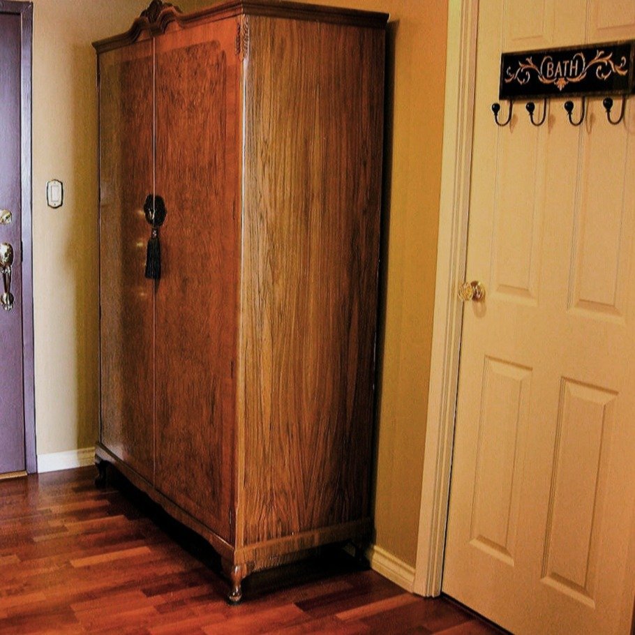 Hiding behind an armoire or wardrobe’s closed doors: